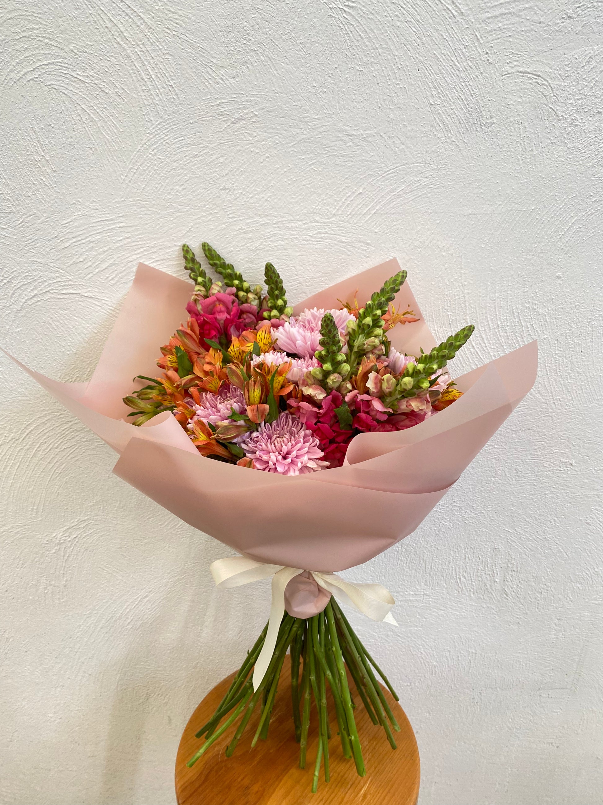 Ramo sencillo compuesto de Perritos, Roxana y Astromelia en tonos rosas y naranjas.
