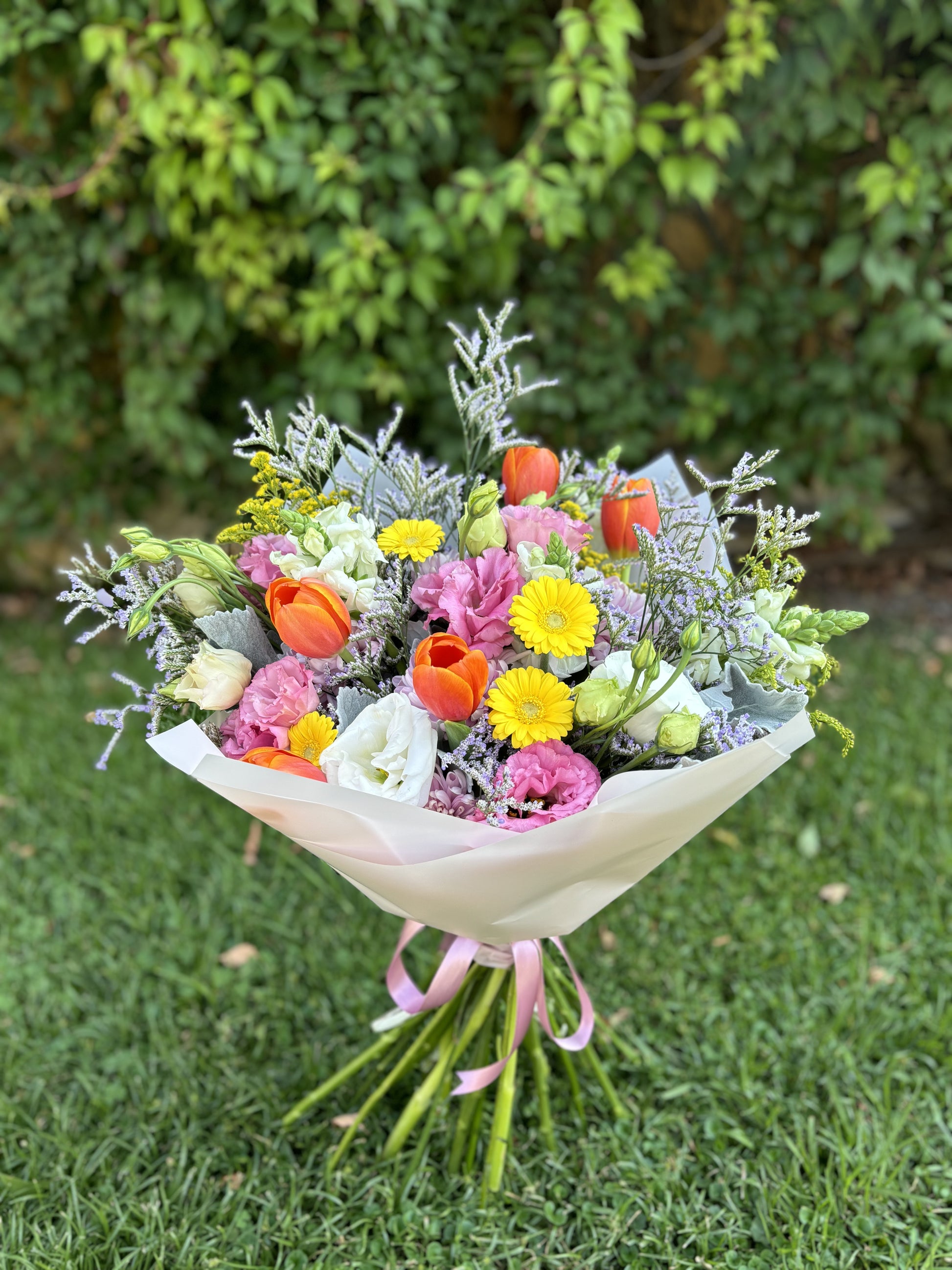 Ramo en tonos vibrantes compuesto de flores premium como Lisianthus, Tulipanes y más!