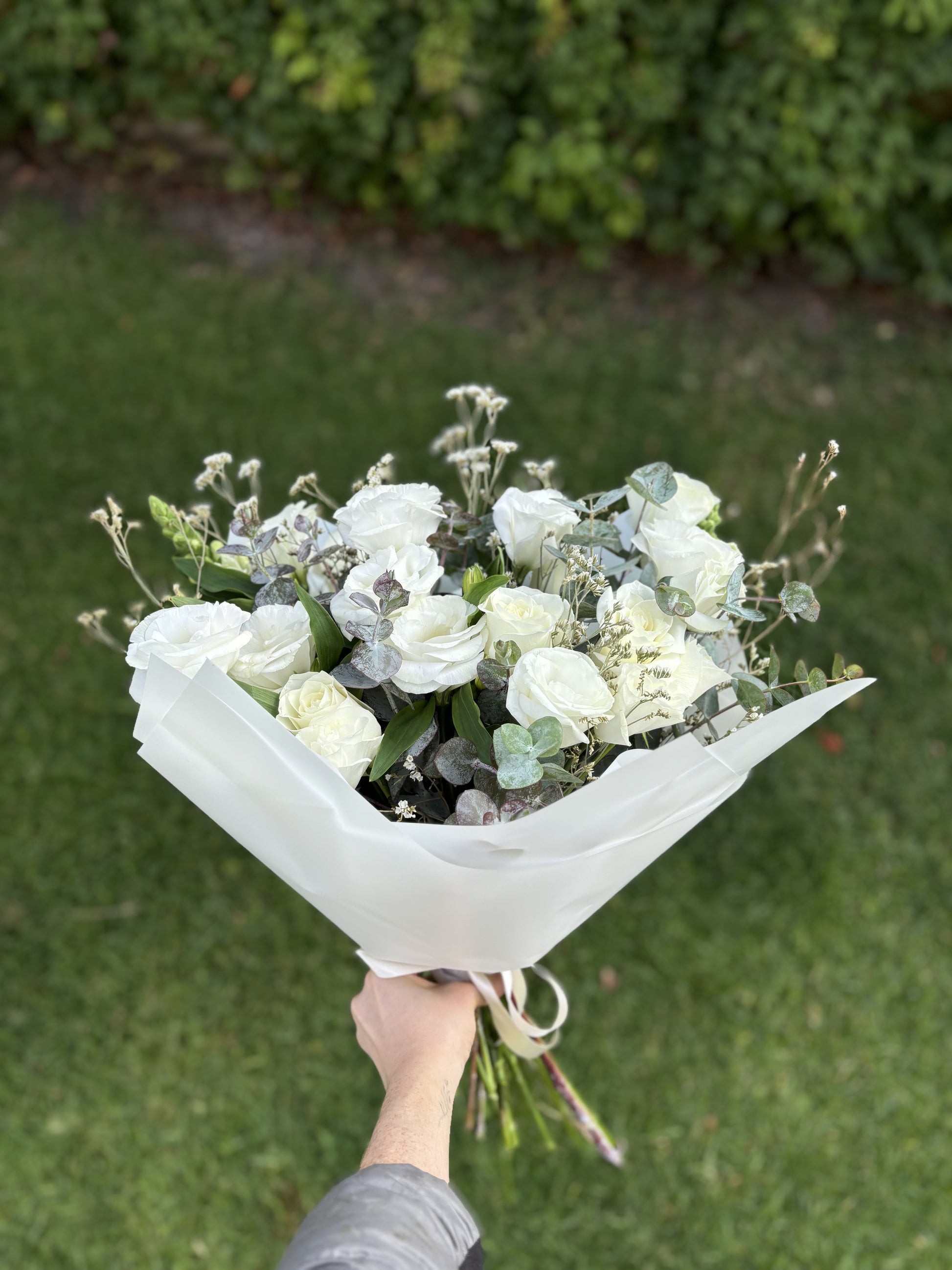 Ramo en tonos blancos compuesto de Rosas y Lisianthus.